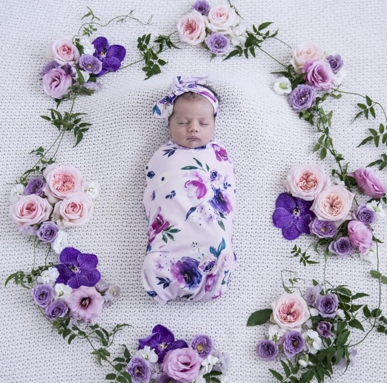 Our Floral Kiss snuggle swaddle and topknot is blush pink filled with lilac, deep pink and purple peonies and roses. Our Floral Kiss snuggle swaddle sleep sack is soft, breathable and for the most stylish babes. Our snuggle swaddle comes with a matching topknot headband.