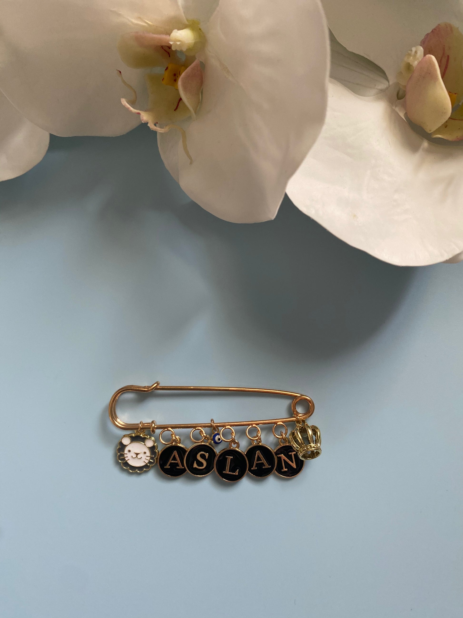 This Pin will come as pictured. The name will need to be 3-5 letter name. You will receive the same charms and letters will be in black.