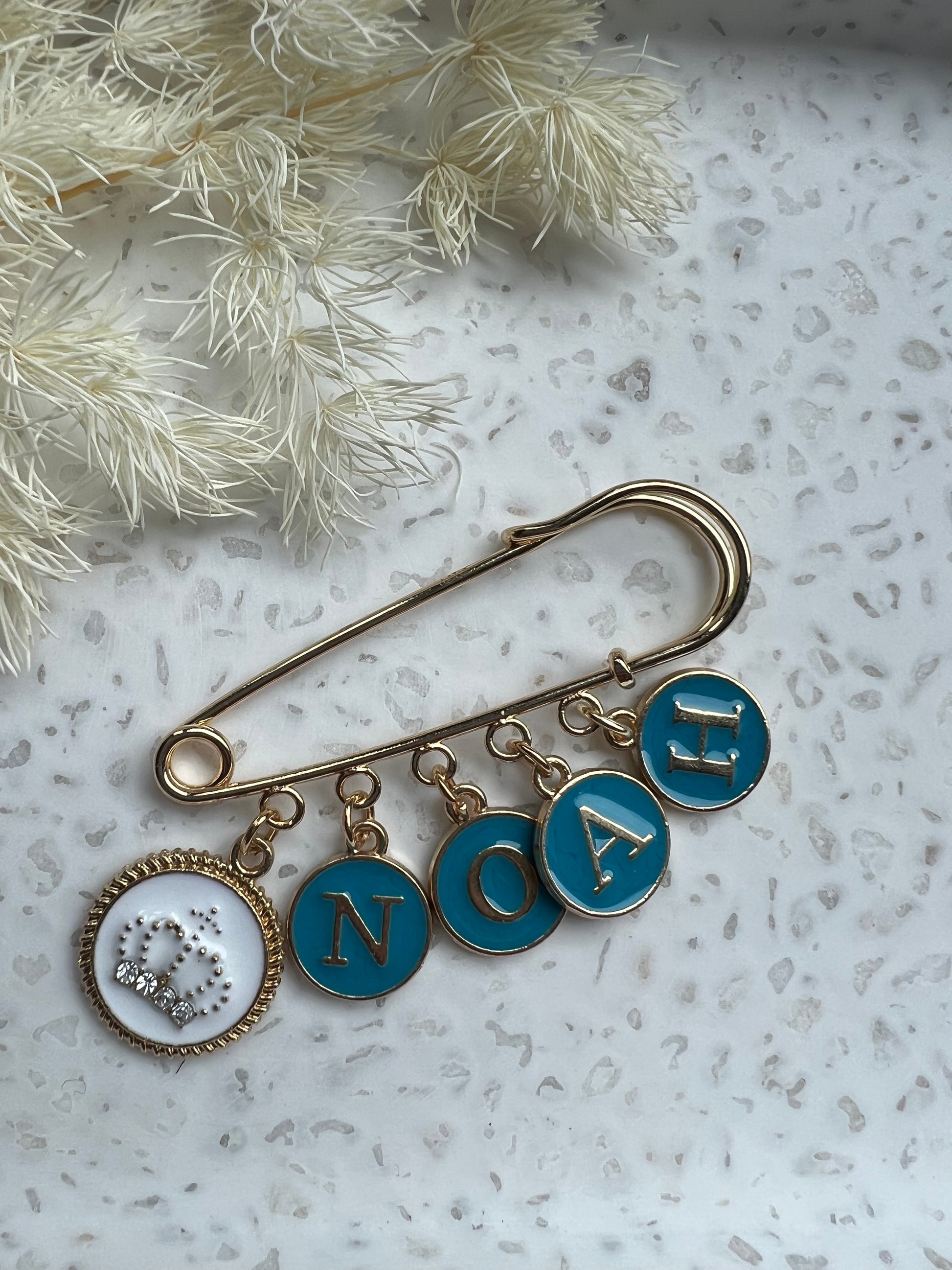 This Pin will come as pictured. The name will need to be 3-4 letter name. You will receive the same charms and same letter colour(blue) .